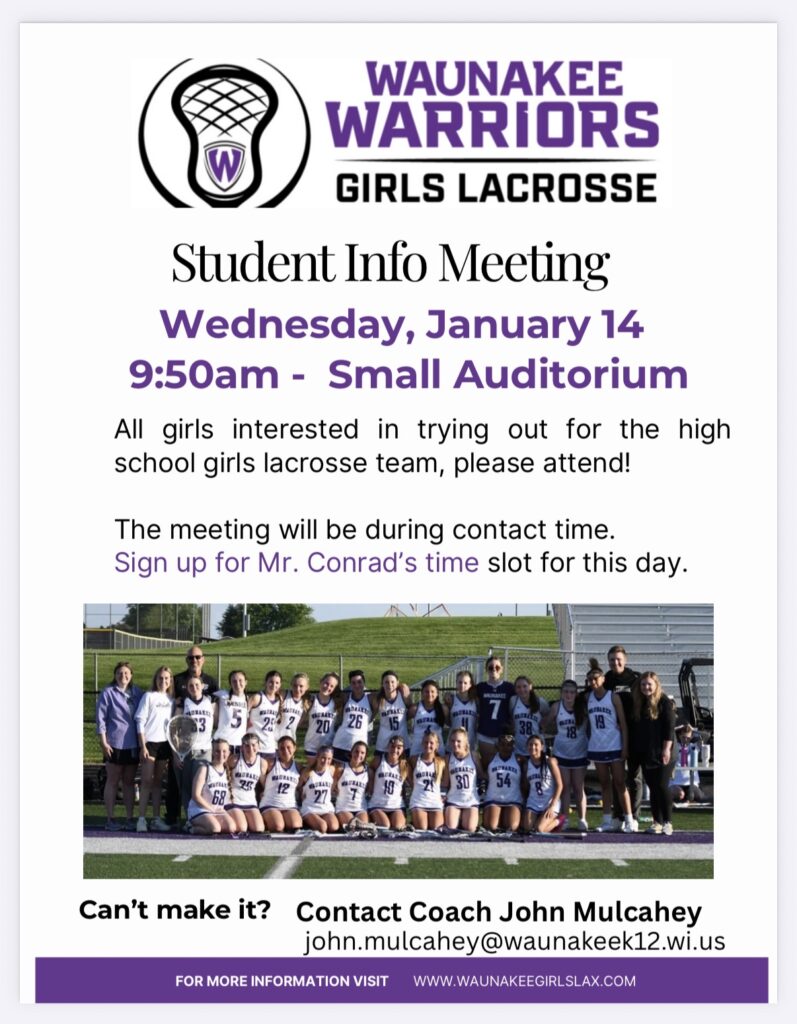 1/14/26 Girls Lacrosse Athlete Informational Meeting By waunakeegirlslacrosse3 | December 30, 2025 | Comments Off on 1/14/26 Girls Lacrosse Athlete Informational Meeting Read More